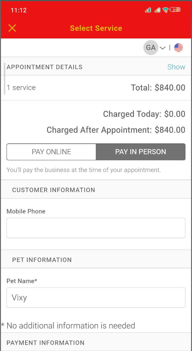 - In the 'Please Select a Pet' field, select an existing pet or add a new one.