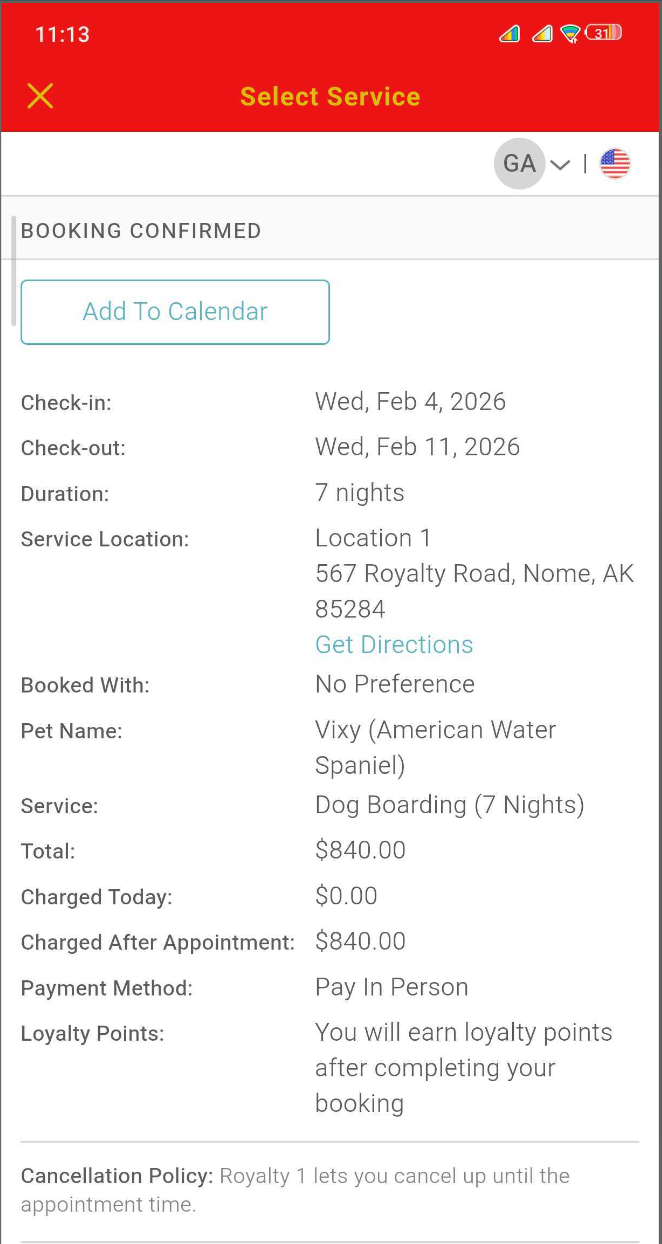 - The booking confirmation page will appear once the appointment is successfully scheduled.