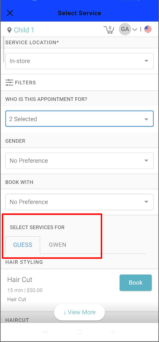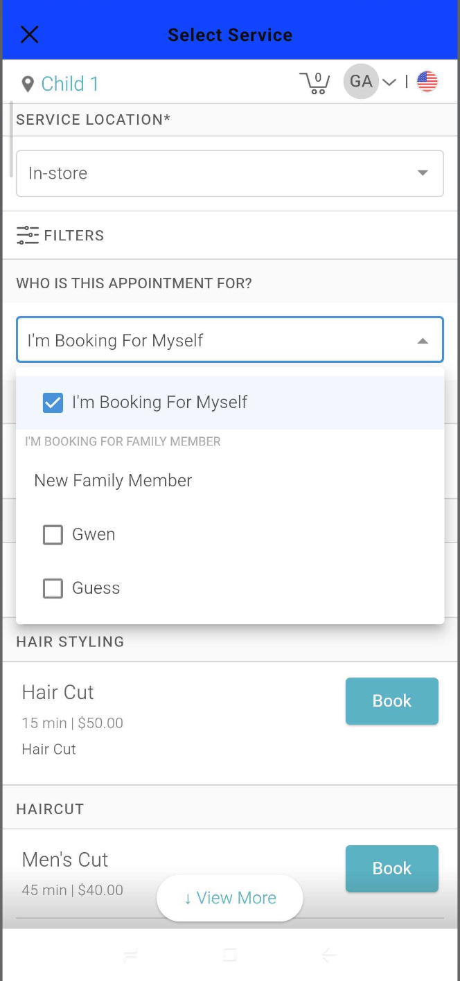 - Browse available services or use the filter option to narrow results by staff member or service category. Tap 'Book' next to the desired service to add it for all selected family members