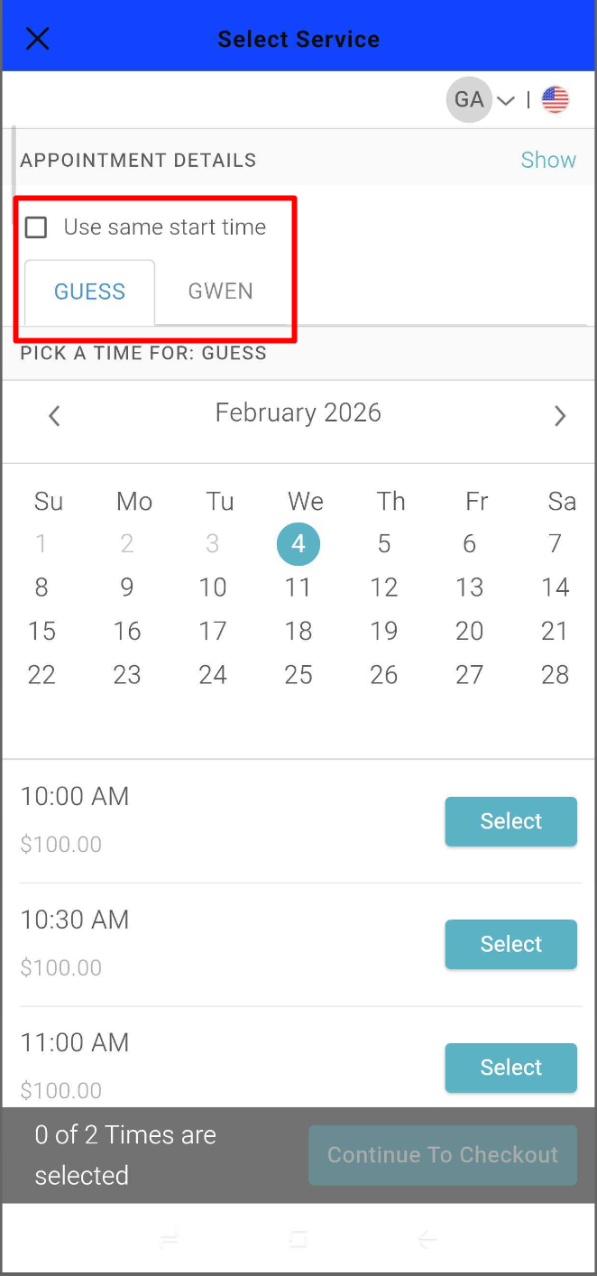 - If the Multi-Staff Appointments setting is enabled, clients will see a checkbox labeled Use same start time on the Pick a Time page. This allows scheduling all appointments to start simultaneously, if desired.