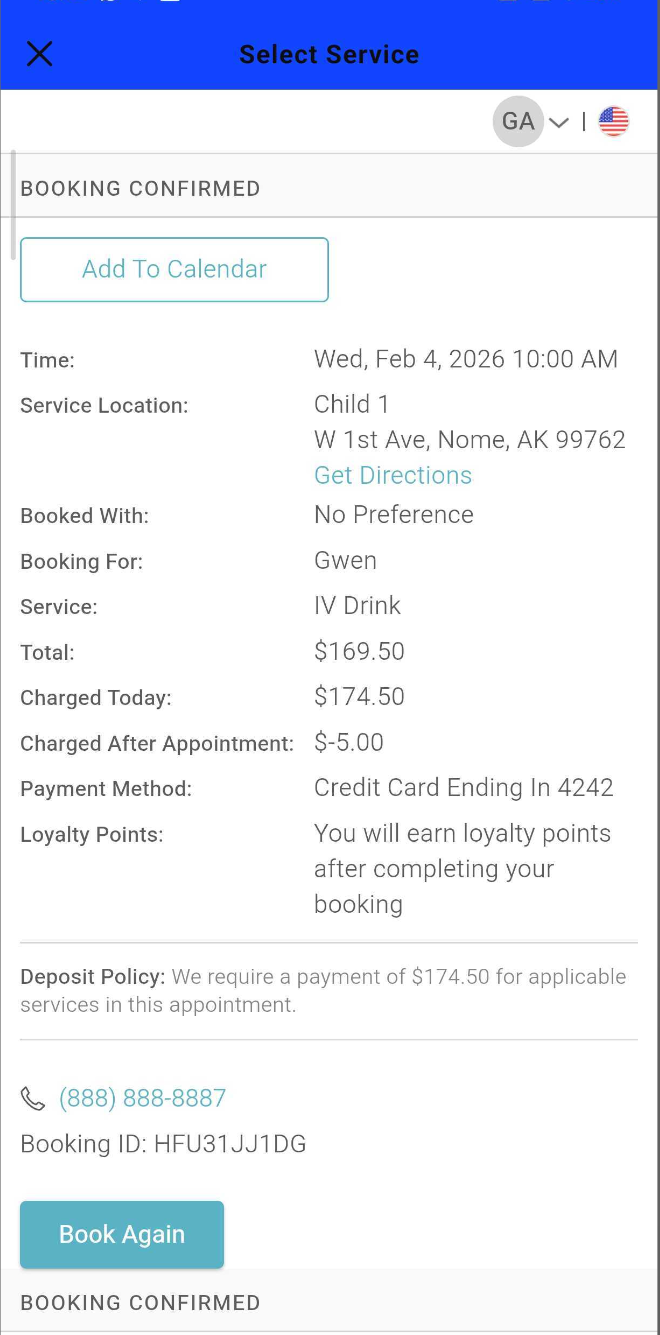 - To book another appointment for the same service, use the Book Again button to navigate to the Time Picker