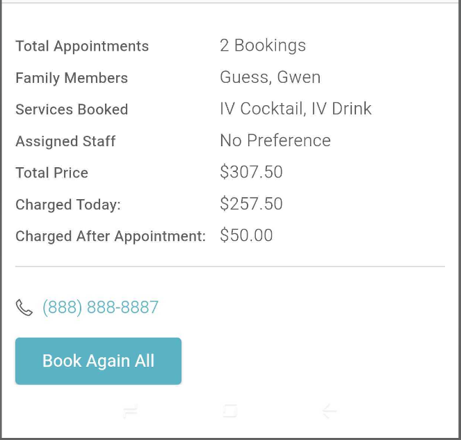 - Clients who book appointments—whether for themselves, or family members, will receive a notification listing all services booked: