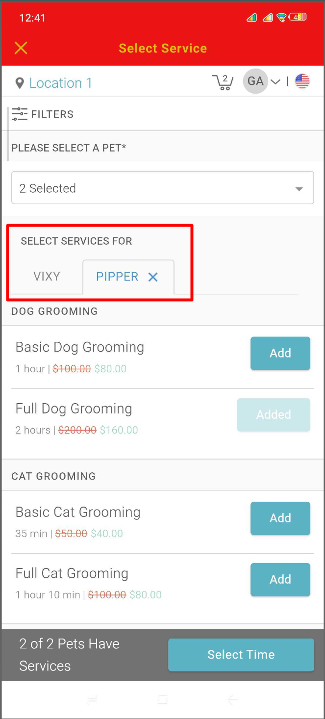 - Tabs labeled with each pet’s name will appear below 'Select Services For'