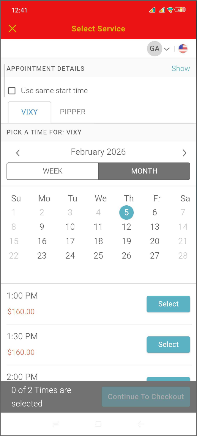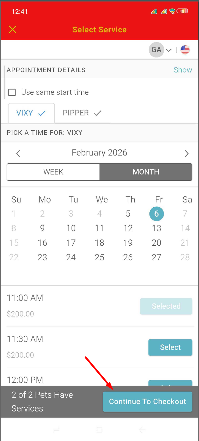 - The "Select a Time" button becomes available only after a service has been chosen for each pet.