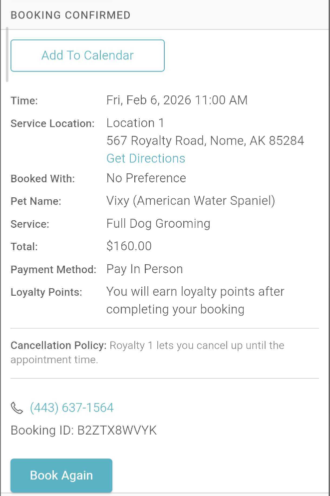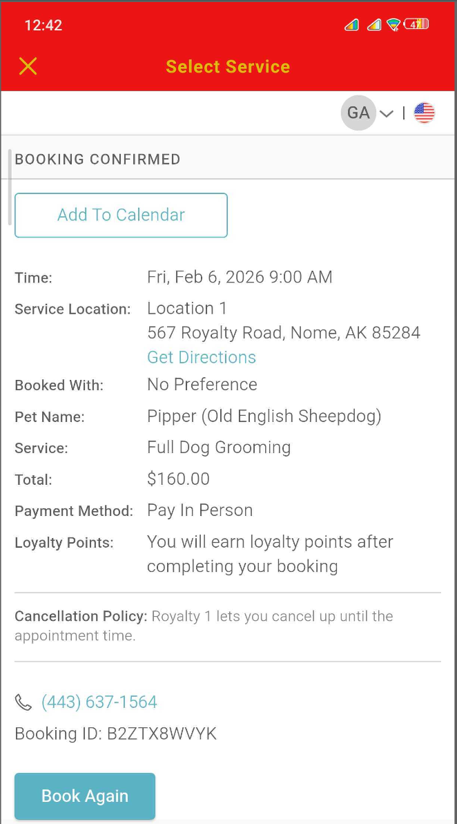 - Tap 'Book Again' to schedule another appointment for the same service.
