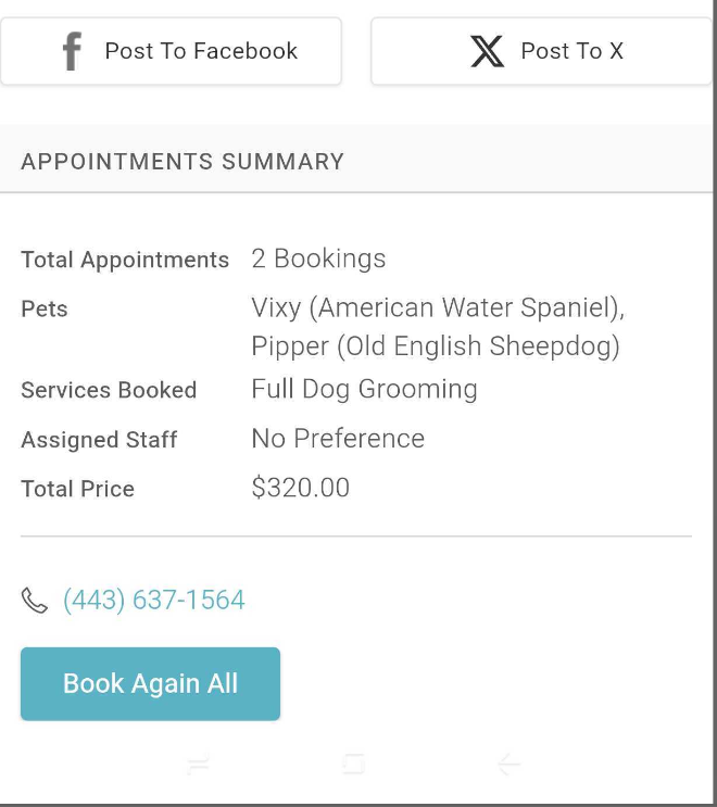- Clients who book appointments for their pets will receive a notification listing all services booked: