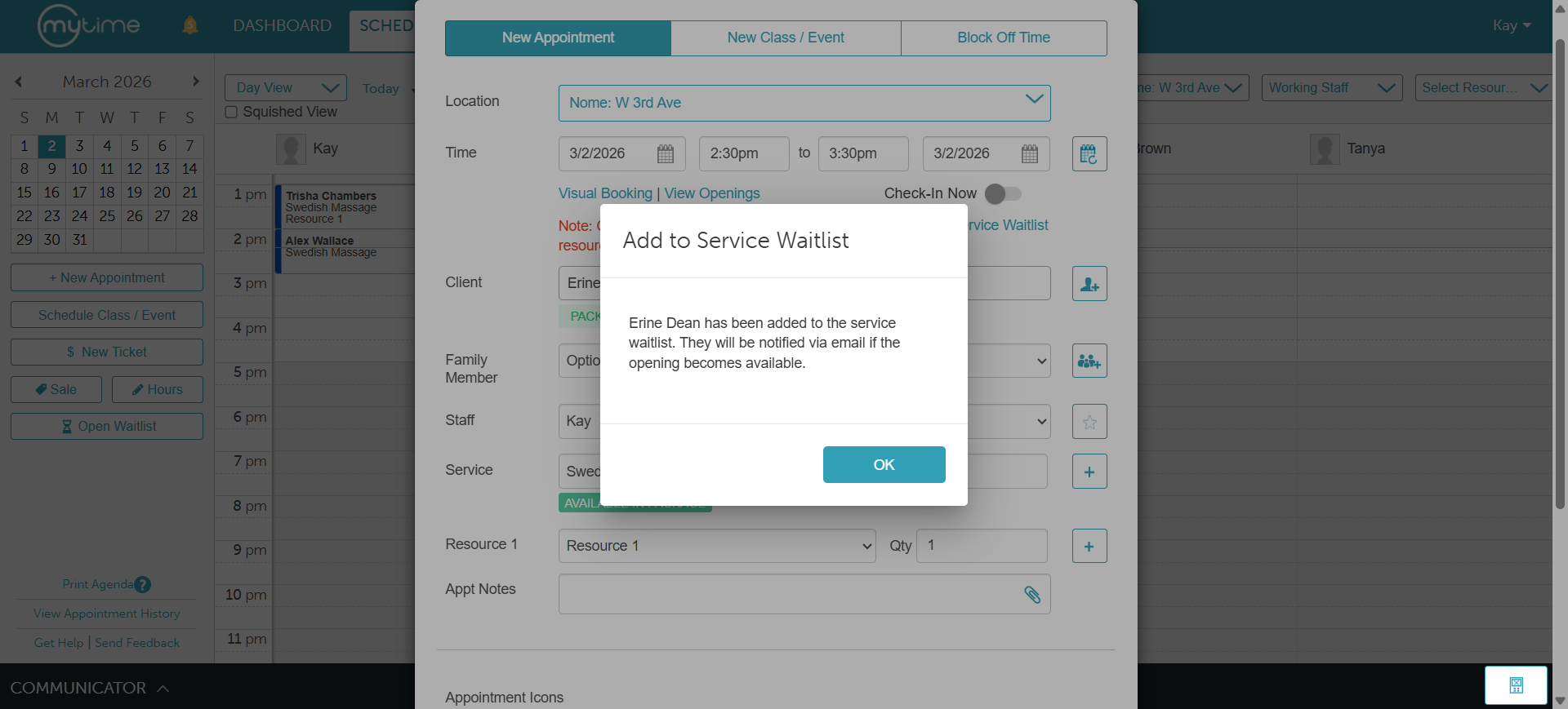 • The "Add to Service Waitlist" option appears automatically whenever a staff member attempts to book a time slot that is already full.