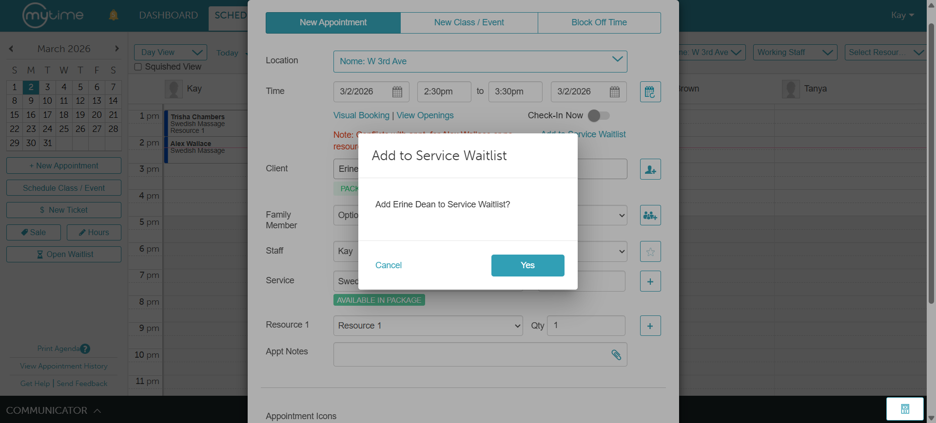 6. A pop-up will appear asking if you would like to add the client to the waitlist; select "Yes."