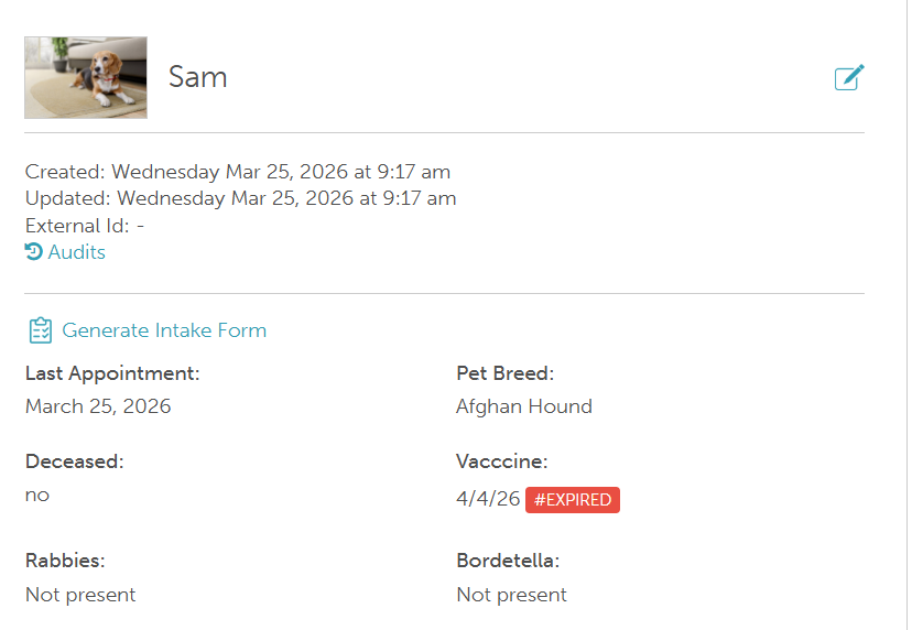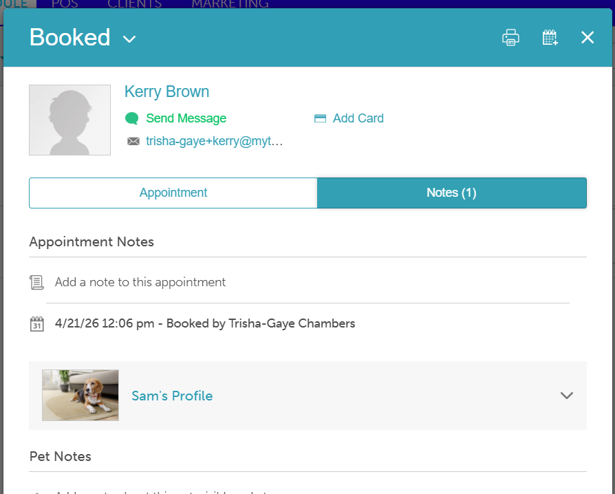 Once saved, the photo will be visible in-store on the pet profile, the appointment tile, and within the Appointment Notes section of the appointment modal.